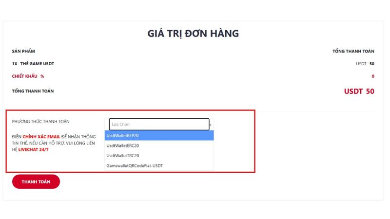 Tại giao diện thanh toán, bạn lựa chọn hình thức chuyển tiền USDT phù hợp với mình: