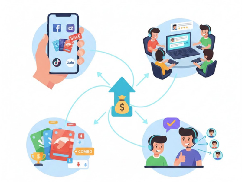 - Tận dụng mạng xã hội: Facebook, TikTok, Zalo và các diễn đàn game là nơi tập trung số lượng lớn người chơi. Việc đăng thông tin bán thẻ, chia sẻ ưu đãi hoặc hướng dẫn nạp giúp thu hút khách hàng tự nhiên mà không cần bỏ nhiều chi phí quảng cáo.