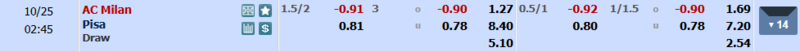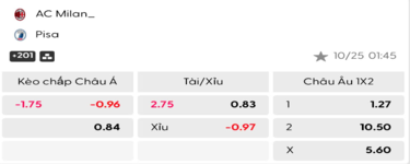 Soi kèo trận đấu giữa AC Milan Vs Pisa